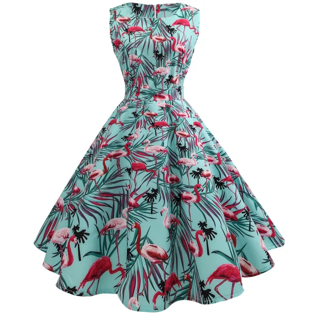 18 Robe Femme Vintage Pin Up Flamingos Printed Dress 50s 60s Wit