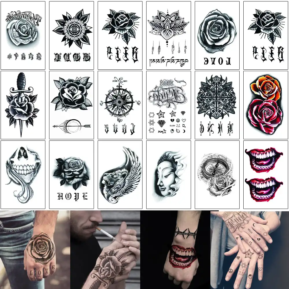 Main Tatouage Autocollant Faux Noir 3d Henne Rose Fleur Loup Crane Joker Cosplay Pour Femme Homme Bras Cheville Impermeable Temporaire Tatouage Aliexpress