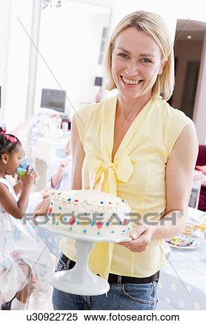 Femme A Fete Tenue Gateau Anniversaire Sourire Banques De Photographies U Fotosearch