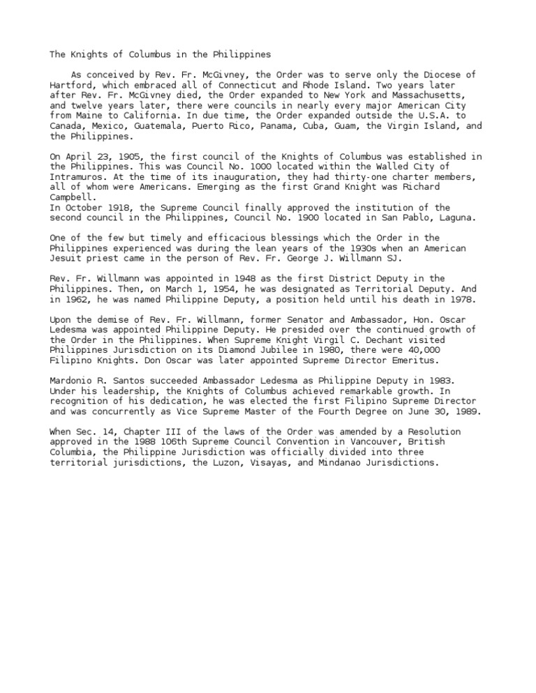 History Of Knights Of Columbus In The Philippines Philippines The United States