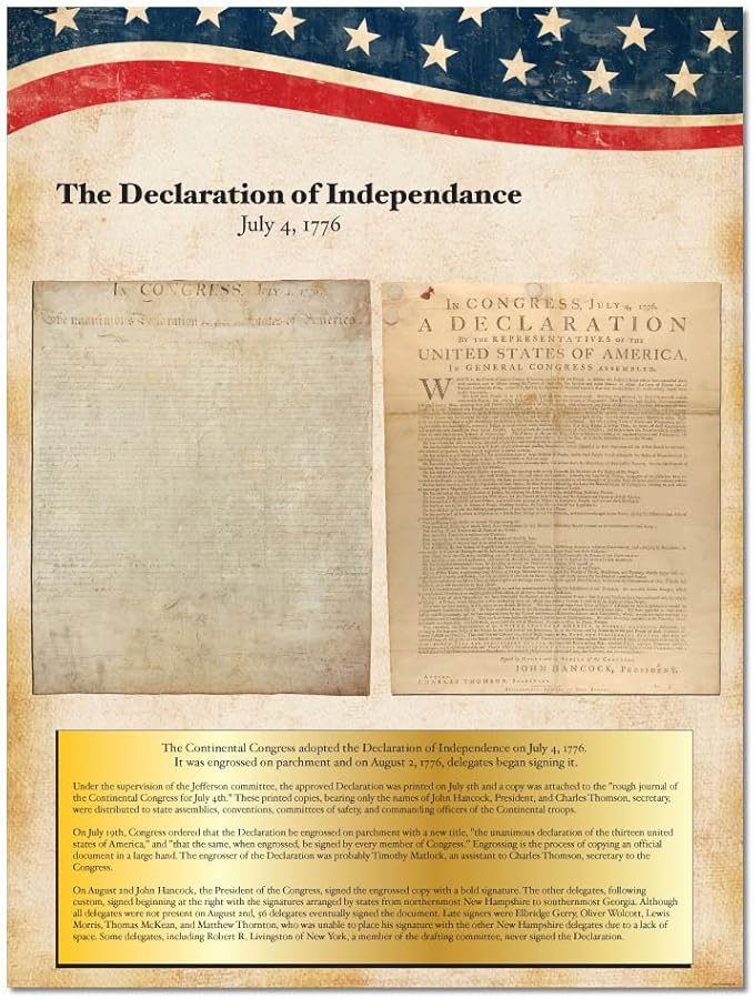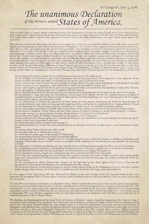 The unanimous Declaration Of The Thirteen States Of America In Congress Shipped with USPS Parcel Select Ground. We, therefore, the Representatives of the united States of America, in General Congress, Assembled, appealing to the Supreme Judge of the world for the rectitude of our intentions, do, in the Name, and by Authority of the good People of these Colonies, solemnly publish and declare, That these United Colonies are, and of Right ought to be Free and Independent States;. That they are Absolved from all Allegiance to the British Crown, and that all political connection between them and the State.