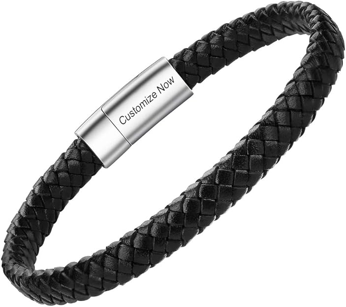 Bracelet En Acier Et Cuir Tresse Avec Message Personnalise Pour Homme