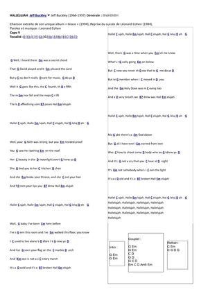 Hallelujah – Jeff Buckley (on donne ce qu'on veut/peut) Diagramme des accords PAROLES Well I heard there was a secret chord That David played and it pleased the Lord the fourth, the fifth The minor fall and the major lift The baffled king composing Hallelujah Hallelujah x4 Your faith was strong but you needed proof You saw her. Toutes les paroles de chanson à imprimer facilement sont sur parolescelebrescom Les titres de chansons comme Hallelujah, de Jeff Buckley prêt à être télécharger en PDF, ou imprimer Vous avez la possibilité de sauvegarder en PDF le document imprimé à partir de cette page web. Hallelujah est une chanson de Jeff Buckley pour laquelle les lyrics ont été ajoutés en 12 Les paroles de Hallelujah ont fait l'objet d'une relecture, cependant, il est fort probable qu'elles contiennent toujours des fautes de frappe N'hésitez pas à proposer vos corrections par mail Vous pouvez écouter la chanson de Jeff Buckley avec la vidéo cidessous.
