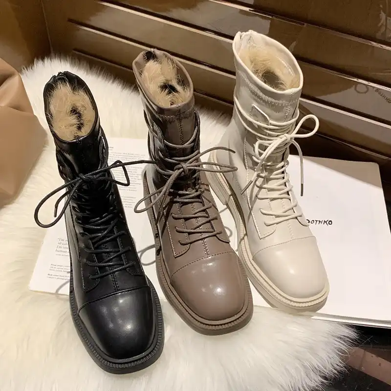 Bottes Cuir Noir Femme Plateforme Moto Chaussons Hiver Impermeable Peluche Neige Botte Femme A Lacets Chevalier Botas Talons Aliexpress
