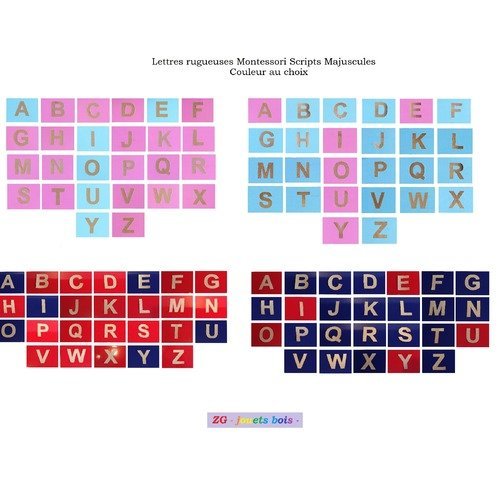 ** Mes lettres rugueuses bcdhj, fgkl, mnpqrst, vwxz, aeiouy ** Les nouvelles lettres rugueuses aeiouy, hcndbk, mpxgzf, rsvwqjlt ** Petit alphabet mobile en cursives, rouge et bleu ** Petits alphabets mobiles en script en trois couleurs, rouge, bleu et noir Attention aux rectoversos !. * La lettre 'Y' peut être considérée comme voyelle ("onyx"), ou semiconsonne ("yoyo") A vous de trancher (a priori on la recontre plus souvent comme semiconsonne);. Maria Montessori associe aux lettres rugueuses trois intérêts majeurs la sensation visuelle et tactilomusculaire associée au son alphabétique cette sensation tactile permet à l'enfant d'absorber avec sa main le geste du tracé des lettres qui restera gravé dans sa mémoire musculaire.