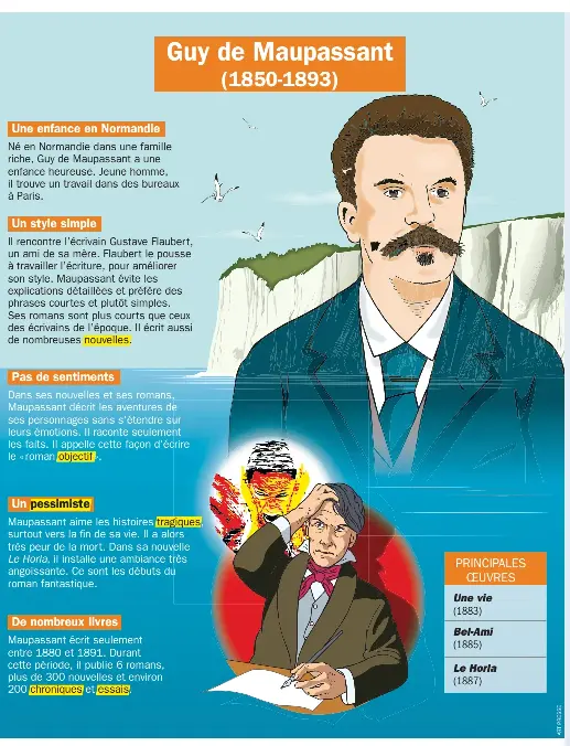 Donneurs de voix Projet collectif Durée –h –min Genre Contes Entre 10 et 10, Guy de Maupassant publia des contes et nouvelles dans les journaux Gil Blas et Le GauloisBon nombre de ces contes furent par la suite publiés dans différents recueils aux titres bien connus de tous Le Rosier de Madame Husson, Mademoiselle Fifi, Les Contes de la bécasse. En vue du Bac de Français, nous vous proposons ici une courte biographie de Guy de Maupassant (1850 13), l'auteur de Bel Ami, d'Une Vie, de Boule de Suif et du HorlaOn rattache Maupassant à deux courants littéraires importants du 19ème siècle le réalisme et le naturalisme, dont Émile Zola et Gustave Flaubert sont deux représentants majeurs. Retrouvez la nouvelle La Folle de Guy de Maupassant extraite du recueil Contes de La Bécasse en vidéo streaming, lecture audio, texte gratuit et images à télécharger.