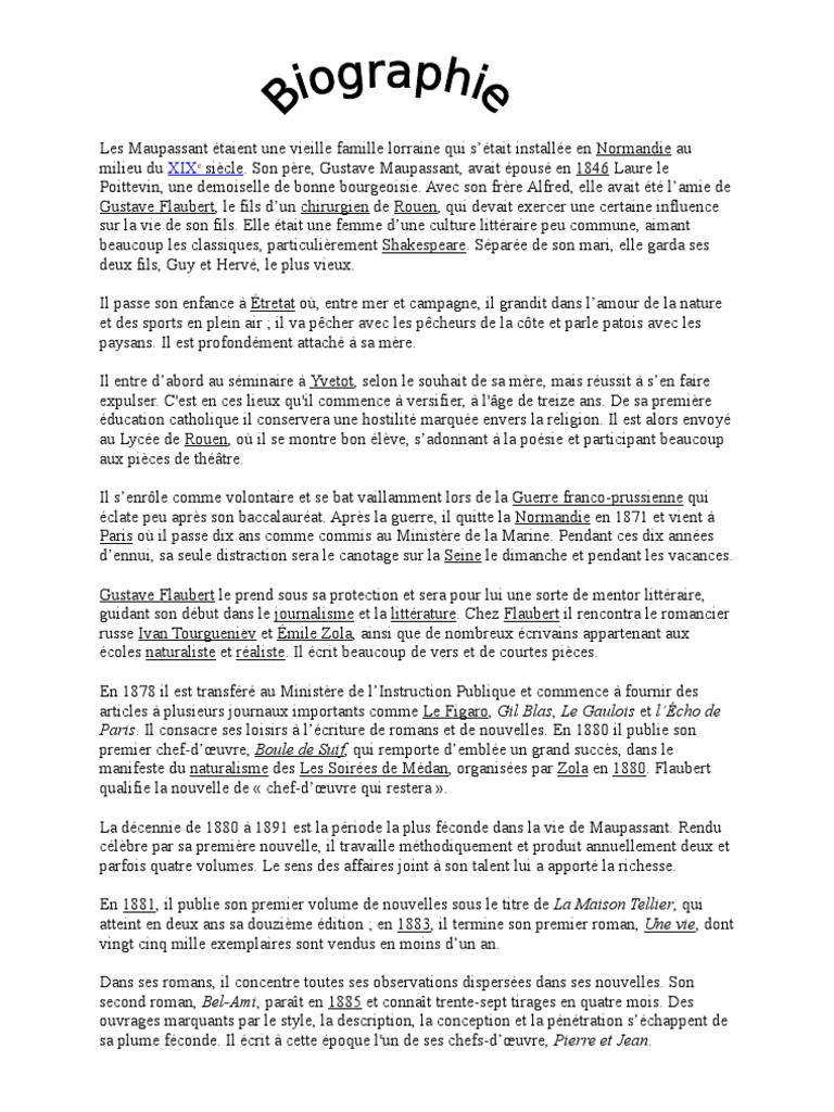 De Maupassant Vera de Villiers de L'IsleAdam En format word Plan du site Accueil > Sur ce site vous trouverez les différentes nouvelles que vous devez lire. Guy de Maupassant est un écrivain et journaliste français né le 5 août 1850 en Normandie et mort le 6 juillet 13 à Paris Auteur du roman Une vie, il est surtout connu pour être le plus grand auteur français de nouvelles Inspiré par Flaubert, on lui doit des œuvres comme Boule de suif ou encore Le Horla (17). Opinion publique (Le Gaulois, 21 mars 11);.