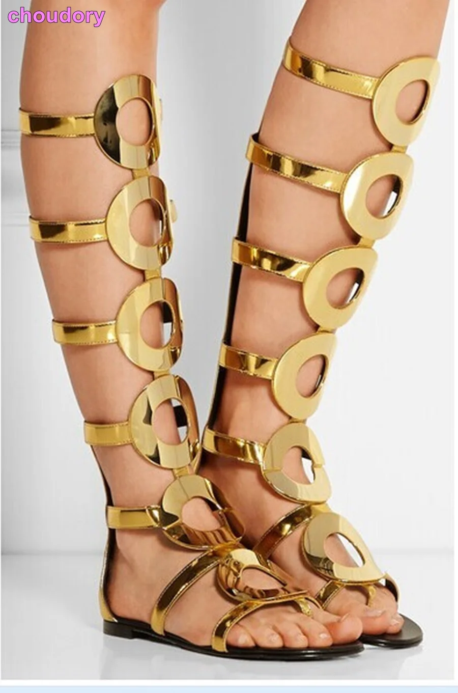 Sandales Plates Longues En Cuir Verni Dore A La Vue Des Yeux Bottes A Sandales A Cage Decoupees Au Genou Chaussures A Grande Bague Bottes A Lanieres Croisees Aliexpress