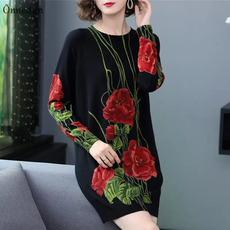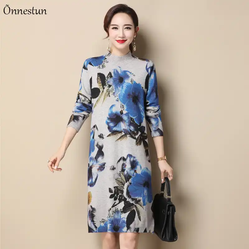 Robe Pull Longue A Manches Longues Pour Femmes Tricot Imprime Floral Pull Grande Taille Automne Aliexpress