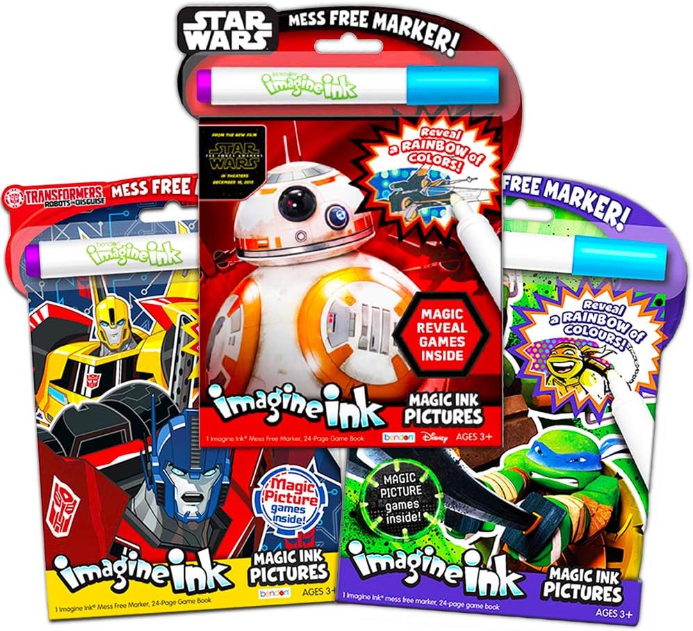 Amazon Com Magic Ink Coloring Book Super Set 3 Imagine Ink Books For Kids Toddlers Featuring Star Wars Transformers Bonus Title With Invisible Ink Pens Mess Free Coloring Bundle Toys Games