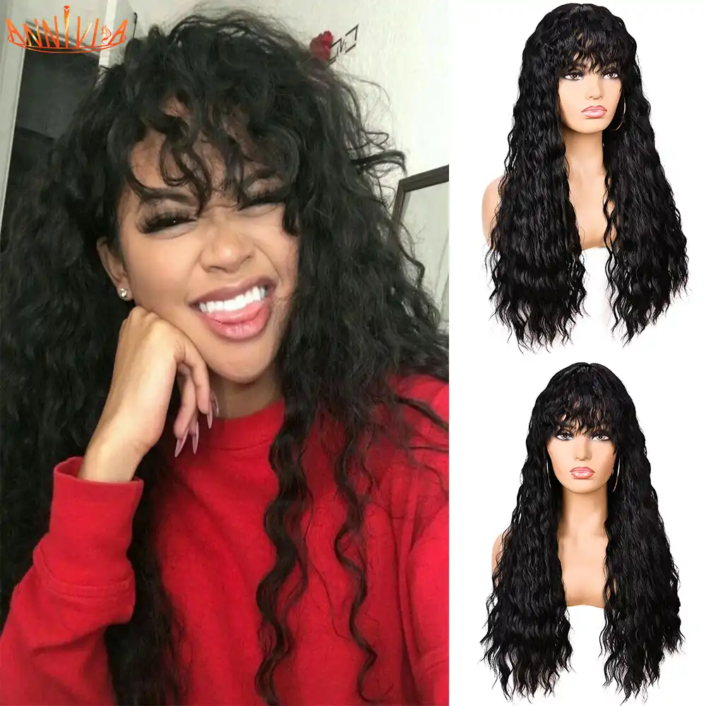Cheveux Longs Crepus Boucles Perruque Avec Frange Pour Les Femmes Noires Naturel Sans Colle Vague D Eau Synthetique Haute Temperature Fibre Cheveux Annivia Aliexpress