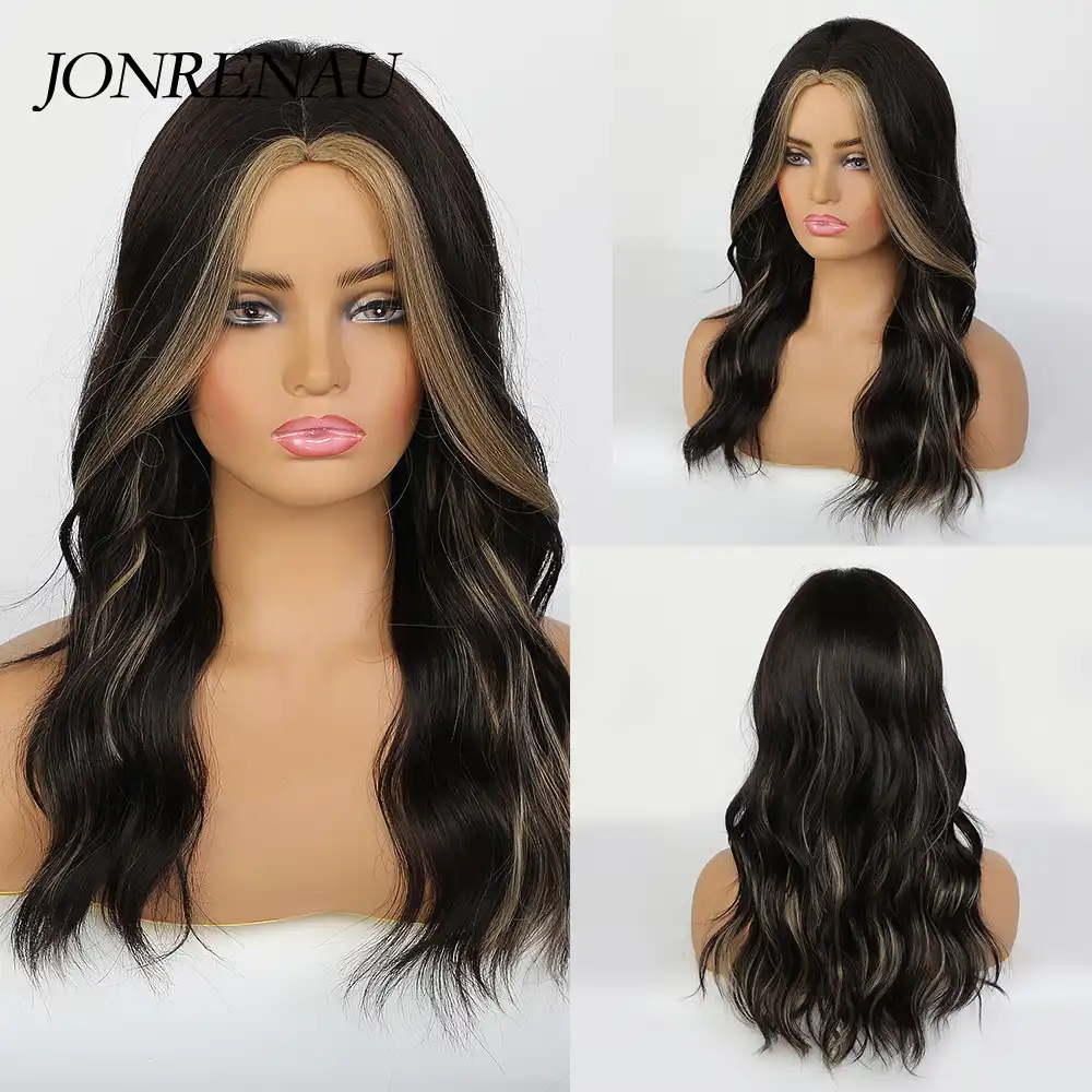 Jonrenau Perruque Naturelle Ondulee Noire Brune A Middle Part Avec Reflets Perruque Synthetique Naturelle Style Fete Cosplay Pour Femmes Noires Aliexpress