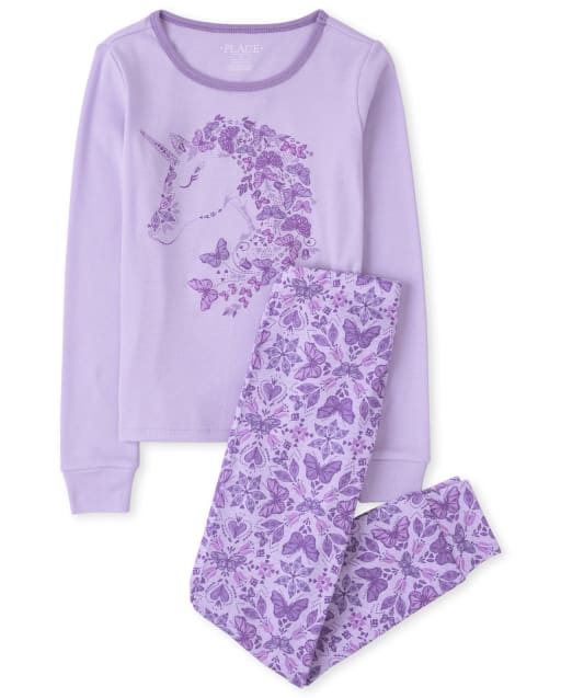 Pyjama En Coton Ajuste A Manches Longues Avec Licorne Papillon Pour Fille