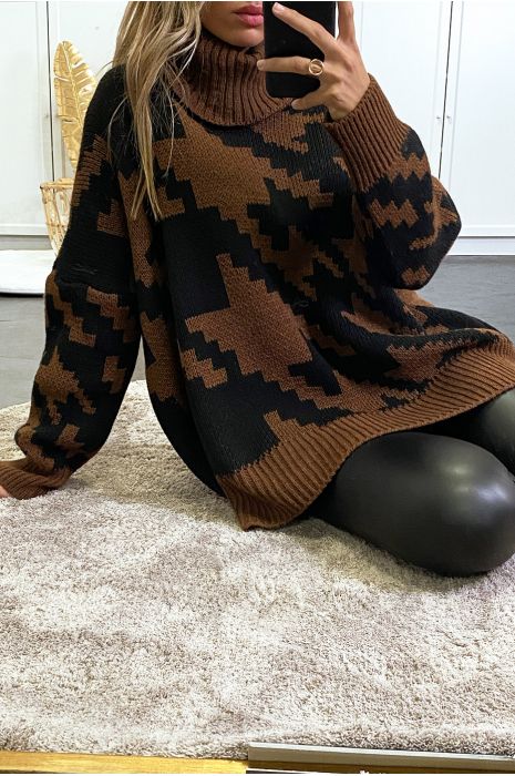 Gros Pull Over Size Marron Col Roule Motif Vichy Mode Femme Pas Cher