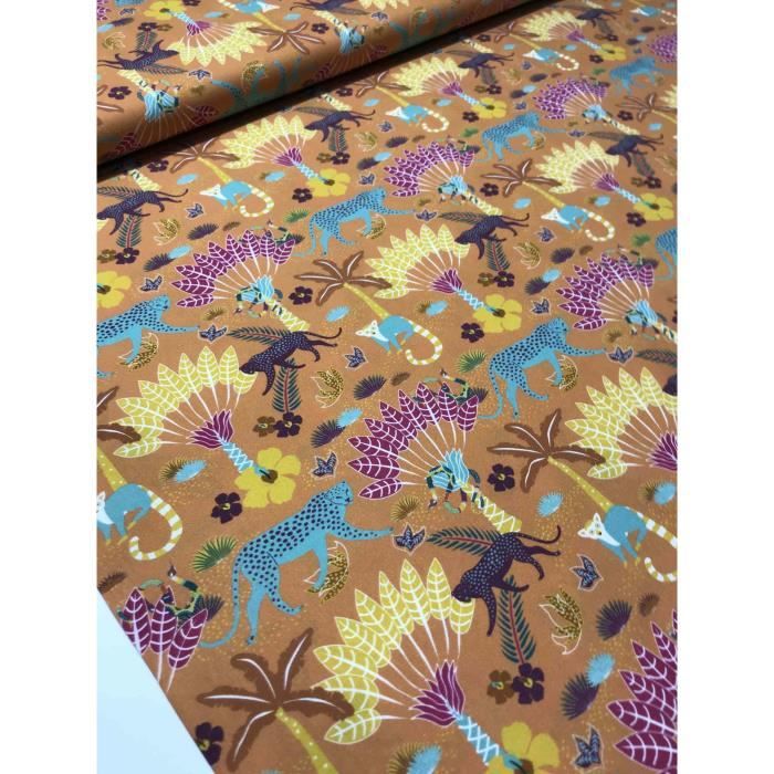 Tissu Coton Imprime Lions Et Feuillages Ocre Et Vert