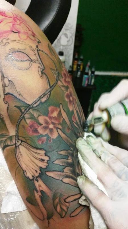 Close Up Japanese Mask Color Art Nouveau Arm Tattoo By Yorick Fauquant Tattoonow
