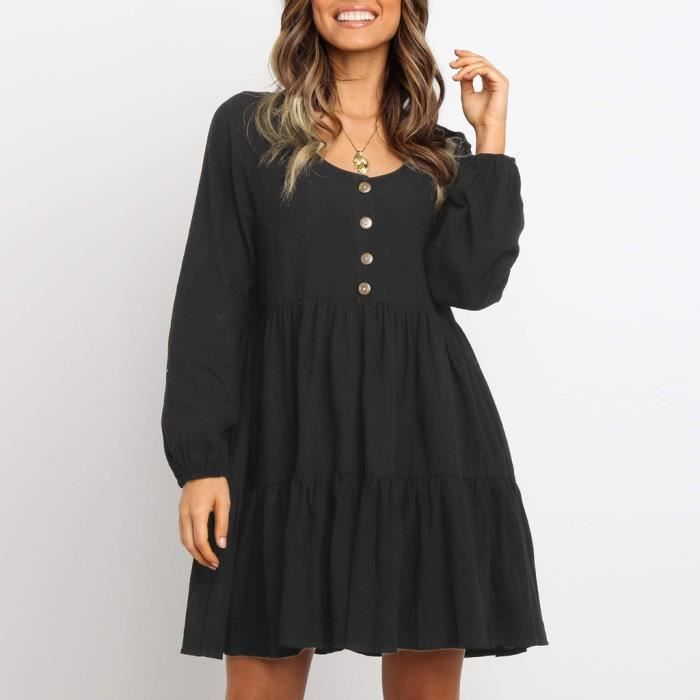Femmes Boheme Manches Longues O Cou Genou Longueur Solide Robe De Soiree Robe Noir Noir Achat Vente Robe Cdiscount