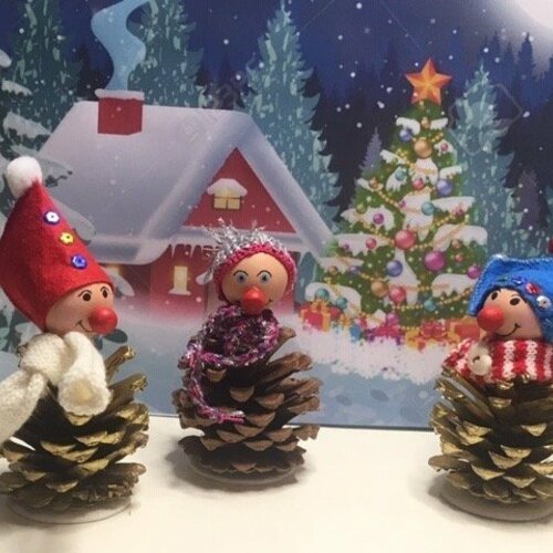 Facile avec une simple pomme de pin de réaliser cette déco rigolote qui épatera vos lutins. Glisser un curepipe entre les dents de la pomme de pin pour faire les bras cliquer pour voir en grand Pour varier coller des petits morceaux de branche, un "faux" cahier de chant ou une petite hache en. Ces petites figurines sont idéales pour décorer des fenêtres, des sapins de Noël ou des couronnes de porte Nous vous souhaitons une belle période de l'Avent !.