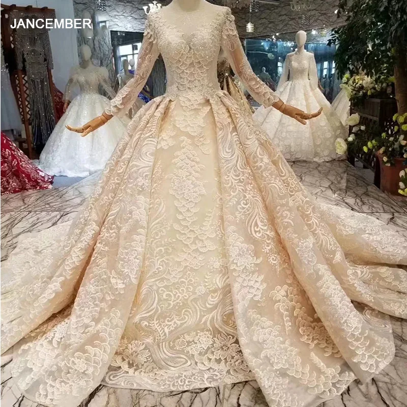 Luxe Champagne Transparentes Robe De Mariee 19 Princesse Col Haut Manches Longues Dos Nu Appliques En
