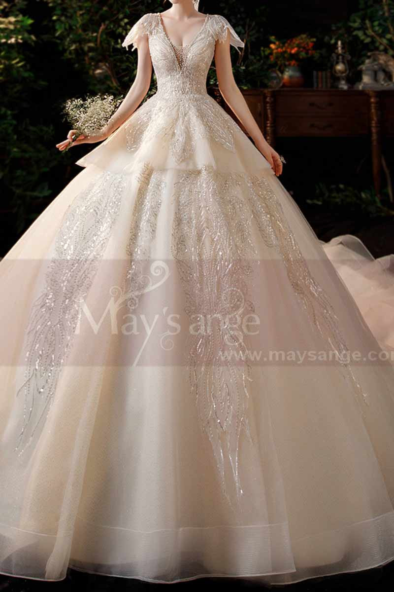 Robe De Mariee De Luxe Longue Traine Decollete En V A Paillettes Et Mancherons Ref M1261 Robes De Mariee