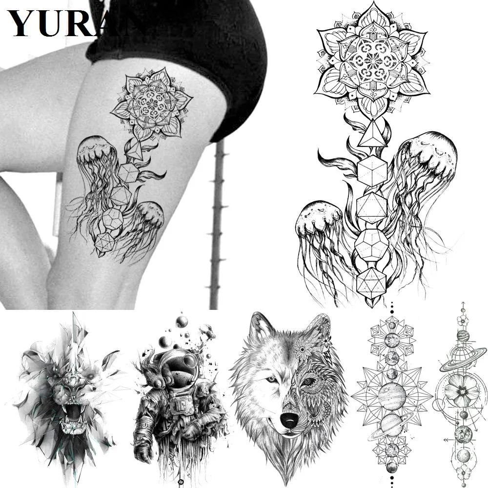 Meduse Noire Loup Mandala Henne Fleur Tatouages Autocollants Faux Impermeable Corps Bras Jambes Tatouage Temporaire Inde Art Personnalise Tatoo Aliexpress