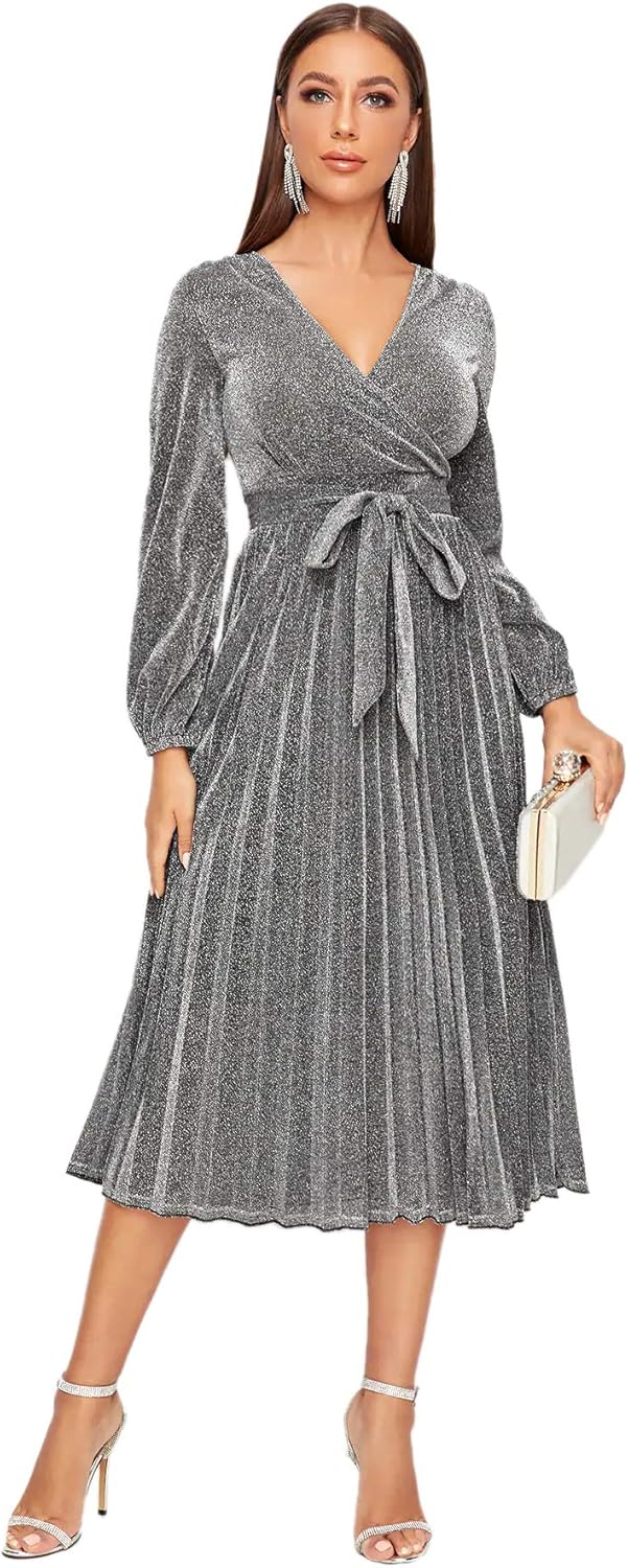 Didk Femme Robe Mi Longue Cache Cœur Brillante Scintillante Plissee Col Fond V Avec Manches Bouffantes Et Ceinture Pour Mariage Soiree Soiree Robes