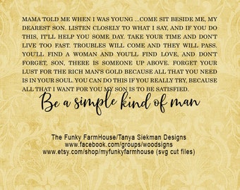 "Forget your lust for the rich man's gold All that you need is in your soul And you can do this if you try All that I want for you my son, is to be satisfied "And be a simple kind of man Oh, be somethin' you love and understand Baby, be a simple kind of man. 🎵 The items that are listed are all DIGITAL DESIGNS which means that nothing physical will be received Included with each download is an SVG file PNG file (transparent background) CPNG file (white back. 🎵 The items that are listed are all DIGITAL DESIGNS which means that nothing physical will be received Included with each download is an SVG file PNG file (transparent.