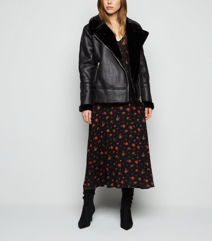 Qed Blouson Aviateur Noir Double De Fausse Fourrure New Look