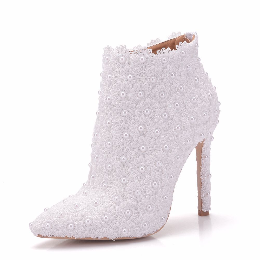 Acheter Nouveau Bout Pointu Chaussures Pour Femmes Blanc Perles Talons Chaussures De Mariage Talon Mince Bottes De Mode De La Dentelle De Fleurs De 45 53 Du Qwr1314 Dhgate Com