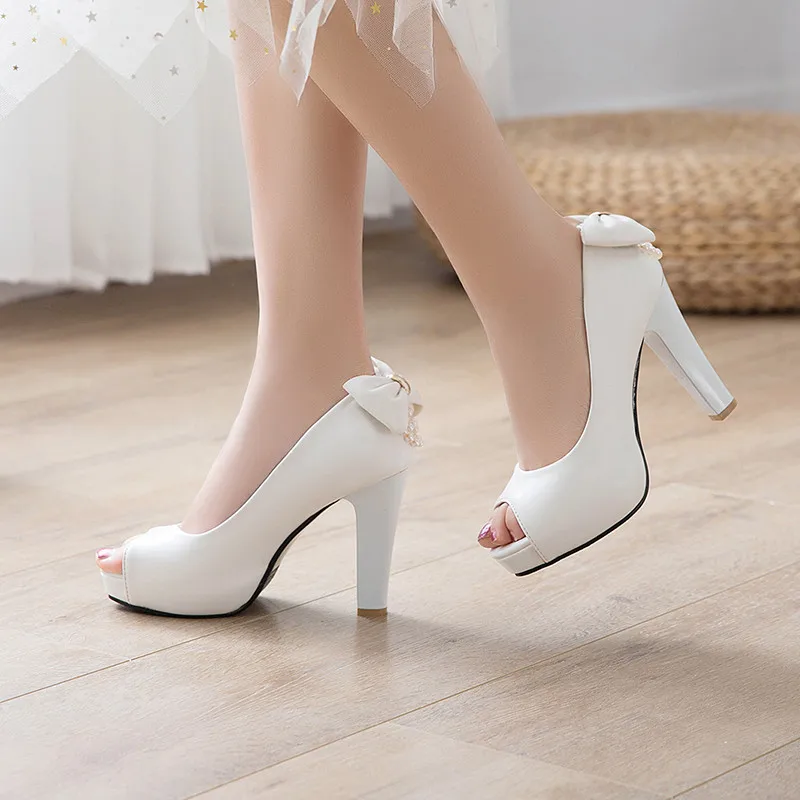 Ymechic Chaussures De Mariage Pour Femmes Blanches Escarpins A Talons Hauts Et Bout Ouvert String Noeud Papillon Avec Perle Grande Taille Collection 19 Aliexpress