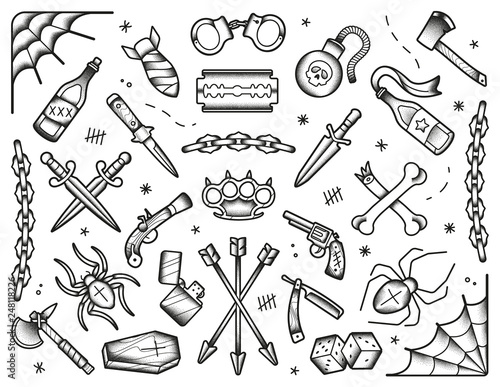 Old School Tattoos Set Black Icons Knifes Bones Bombs Pistols Hand Drawn Dotwork Isolated Illustration Eps10 Vector Acheter Ce Vecteur Libre De Droit Et Decouvrir Des Vecteurs Similaires Sur Adobe Stock